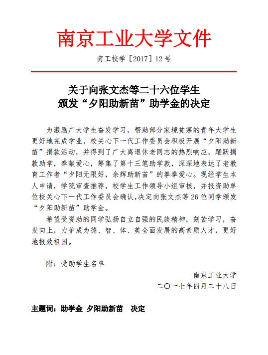 【学校发文】 关于向张文杰等二十六位学生颁发“夕阳助新苗”助学金的决定